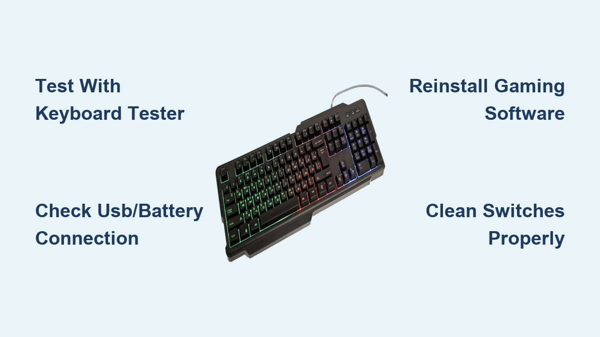 Open Keyboard Tester or Aqua KeyTest—free utilities that show every keypress visually. Press each key individually while watching for specific failure patterns. No response indicates complete electrical failure, while intermittent response suggests loose connections or dirty contacts. Keys stuck in the “on” position typically signal physical jams or liquid damage, and wrong character output points to software mapping issues. Document any patterns you notice—gaming keyboards often fail in predictable clusters that reveal the root cause.