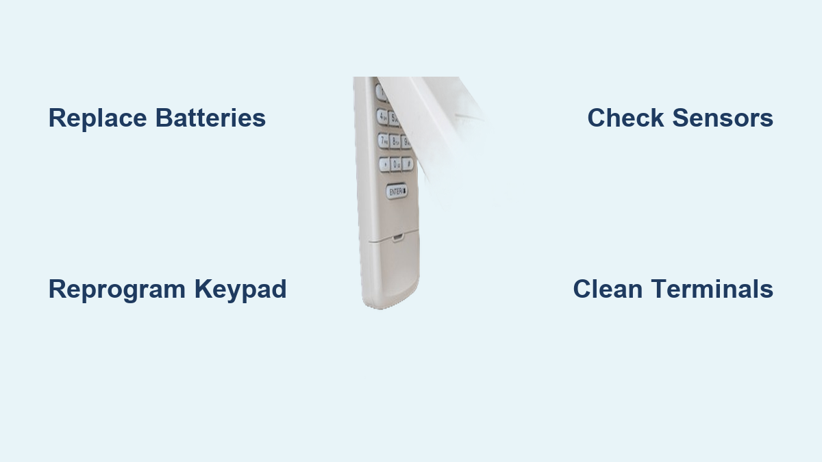 Start with the simplest solution that solves 70% of blinking keypad issues. Remove the keypad cover and inspect battery terminals for telltale white or green corrosion. Use a cotton swab dipped in vinegar to gently clean any buildup, then dry thoroughly with a soft cloth. Test each battery with a multimeter—voltages below 1.3 per cell indicate imminent failure. Critical tip: Install new batteries one at a time to maintain power to the memory circuit, preventing complete code loss. Premium lithium batteries outperform standard alkalines in extreme temperatures and last significantly longer.