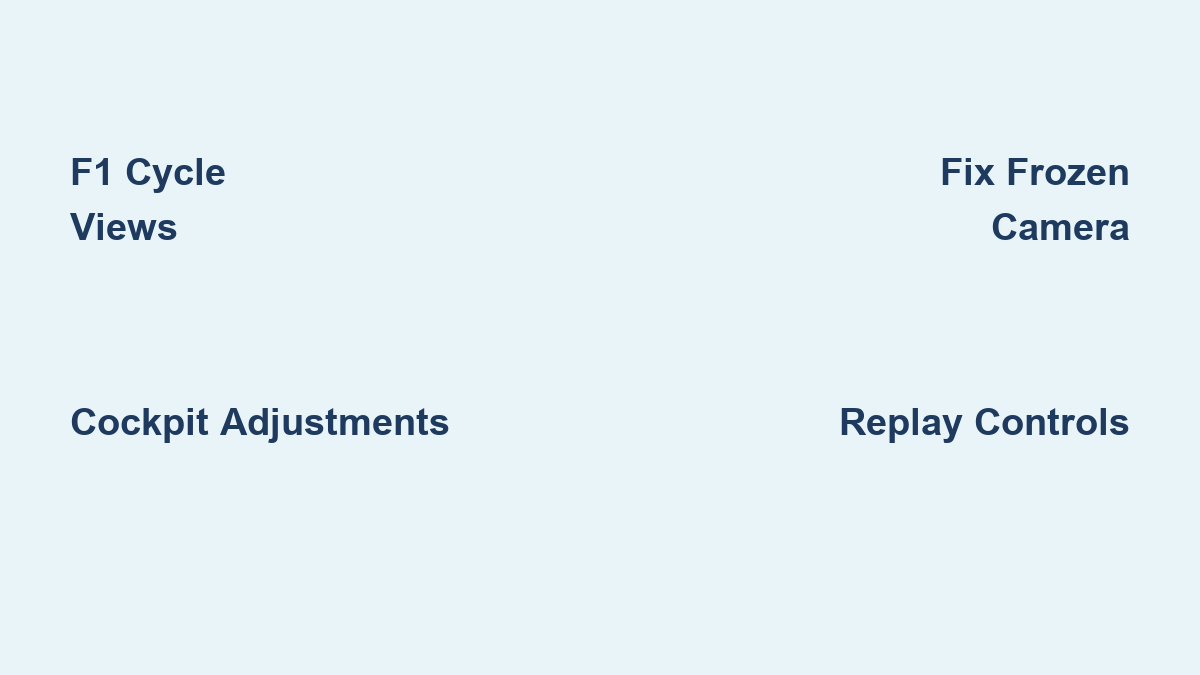 - Numpad 7/9: Roll camera for banked corners (rarely needed)