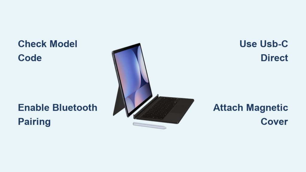 Enter your model code at Samsung’s support site. Tab S6 Lite (2022) supports Bluetooth and USB-C but not magnetic covers, while Tab S9 FE requires the Book Cover Keyboard (model EJ-CT715). Older models like Tab A7 won’t recognize USB-C keyboards at all. Skipping this step wastes money and risks port damage from incompatible magnetic pins.