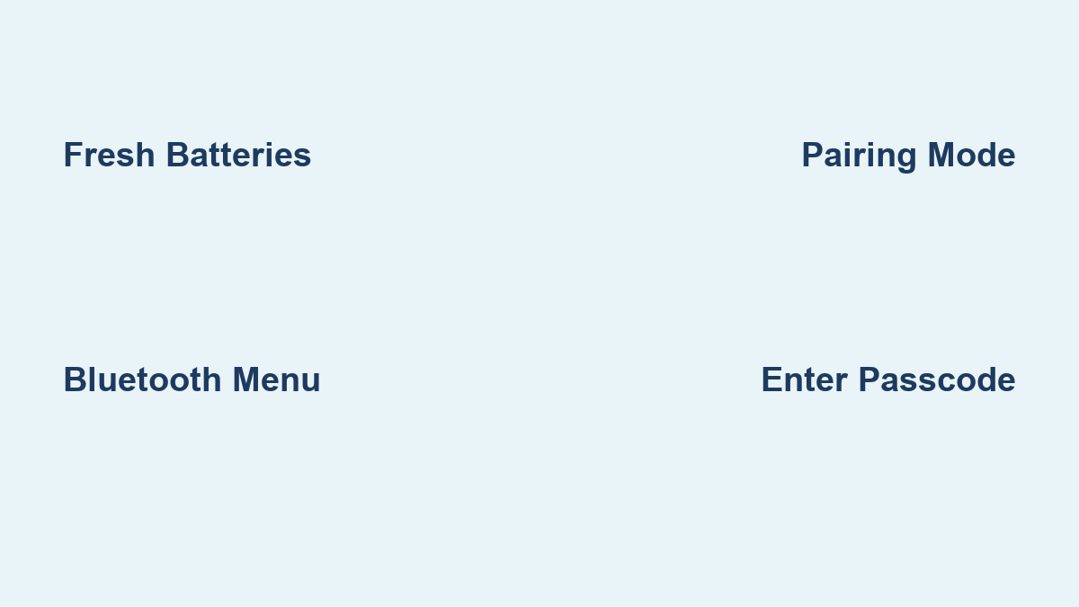 1. Fresh batteries → 2. Turn on → 3. Bluetooth menu → 4. Connect → 5. Enter passcode