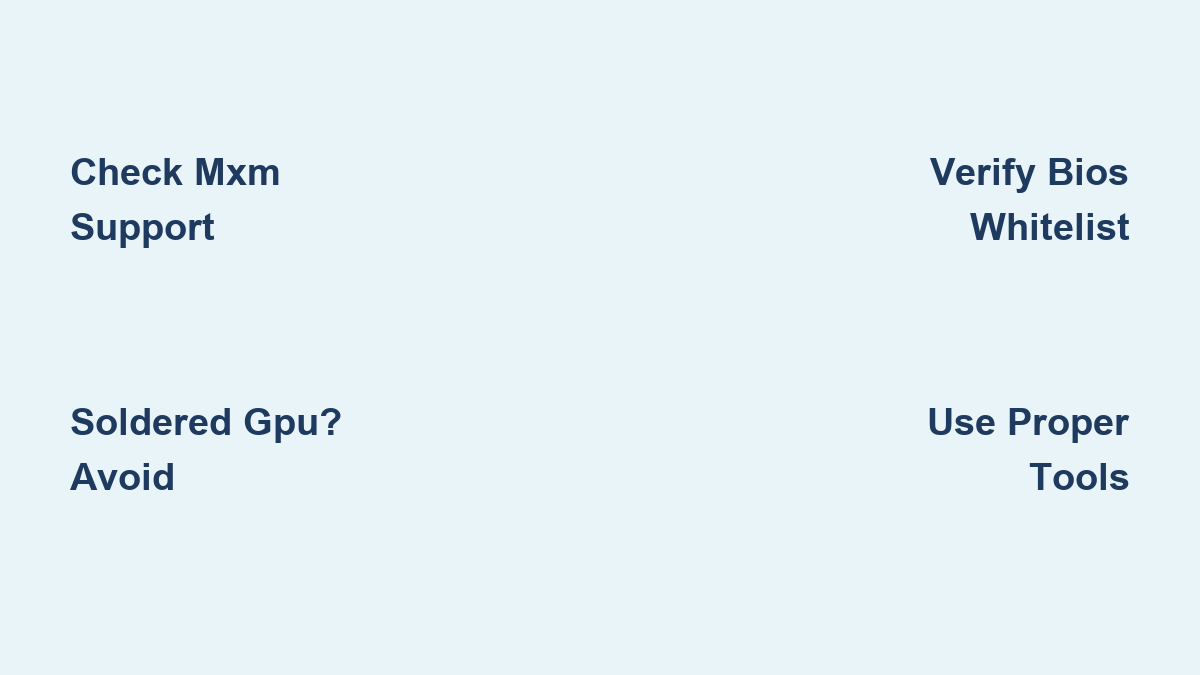 Manufacturers implement BIOS whitelists that prevent “unauthorized” hardware from initializing. Even if you physically install a compatible MXM card, your laptop may refuse to recognize it due to firmware restrictions. Research your specific model on enthusiast forums, but be wary of unverified claims. Some users share modified BIOS versions that remove these restrictions, but flashing alternative firmware carries significant risks of permanently bricking your machine.