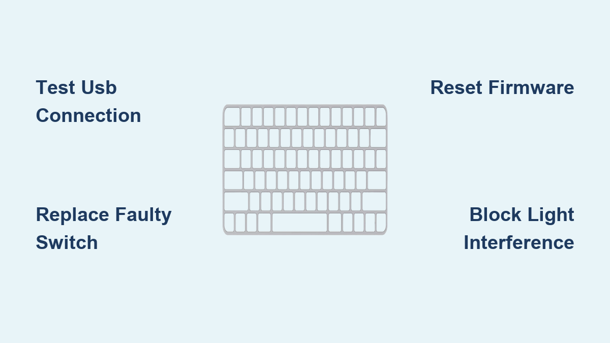 Optical keyboards using Flaretech or Wooting technology are uniquely vulnerable to environmental factors. Bright light hitting the sensor at precise angles triggers false keypresses, particularly on Caps Lock, Tab, or Control keys. This differs from mechanical switch issues as symptoms appear only under specific lighting conditions.