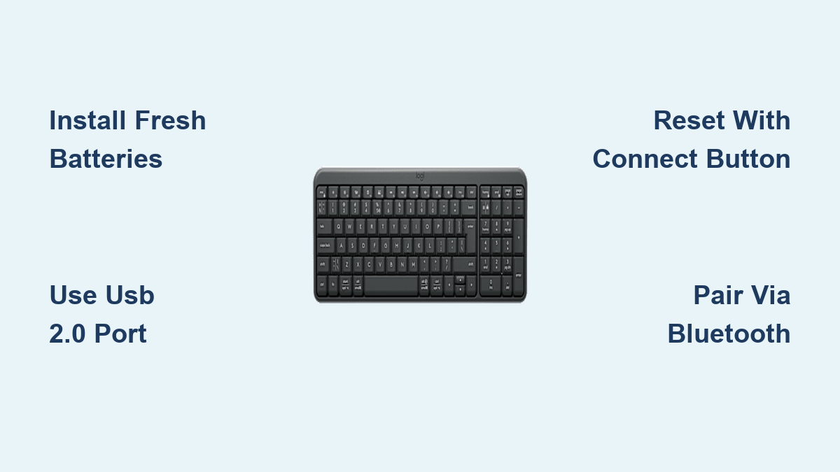 Dead batteries are the #1 cause of failed sync attempts. For non-rechargeable models like the K350, replace both AA/AAA cells with new alkaline batteries – never mix old and new. Rechargeable keyboards (K750, MX Keys) require at least 20% charge before pairing; plug into a wall adapter (not a computer USB port) for 15 minutes if the LED blinks red. A solid green LED during power-on confirms adequate power for signal transmission.