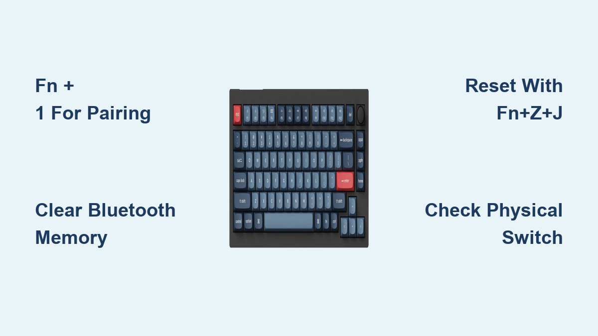 Hold Fn + Z + J for 3 seconds until the LED flashes white. This nuclear reset erases all three device slots—essential when switching between operating systems. Wait 10 seconds before re-entering pairing mode to let the Bluetooth module reboot.