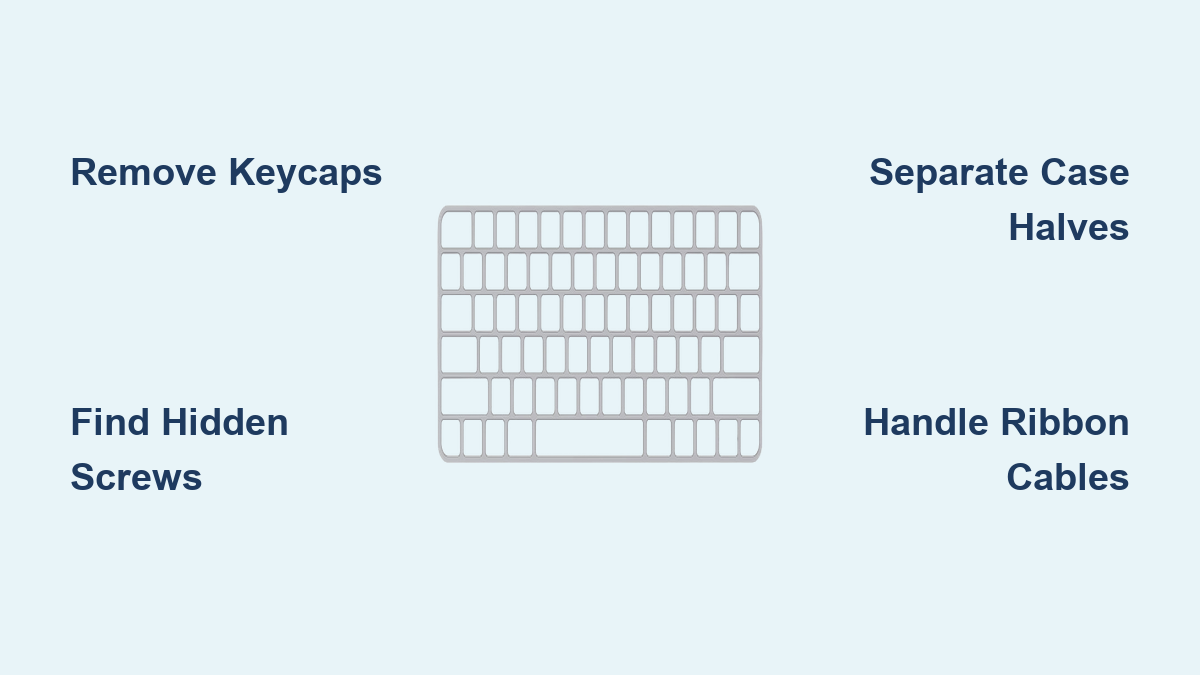 Spot these: Ultra-thin keys with minimal travel (laptops or Apple keyboards). These are landmines—pry too hard, and plastic scissor mechanisms snap. Never yank keys upward; instead, slide a plastic tool under the top edge and lift horizontally. Skip keycap removal entirely if possible—focus on case screws only. Difficulty: ★★★ (Advanced).