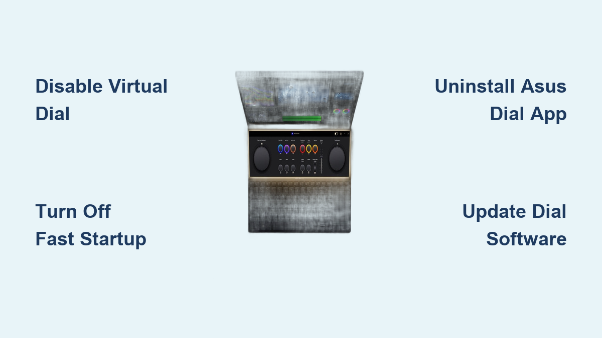 This hidden culprit reactivates the dial after sleep cycles. Search “Control Panel” in Start menu, go to Hardware and Sound > Power Options > Choose what the power buttons do. Click Change settings that are currently unavailable, then uncheck “Turn on fast startup”. Save changes and restart. Fast Startup preserves kernel sessions during shutdown, causing ASUS Dial to reload its settings. Without this fix, even uninstalled dials may reappear after hibernation. Expect a 5-10 second longer boot time—a small price for dial-free operation.