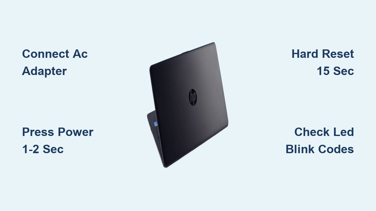Quick Reference: Connect AC adapter first, press power button 1-2 seconds firmly. No response? Hard reset: unplug AC, hold power 15 seconds, reconnect, press once. Still dead? Count amber blinks—2=BIOS issue, 3=RAM failure, 4=GPU problem. For silent Spectres/Envy, feel for side-mounted capacitive buttons requiring firm pressure. Always charge stored laptops 30+ minutes before first startup.