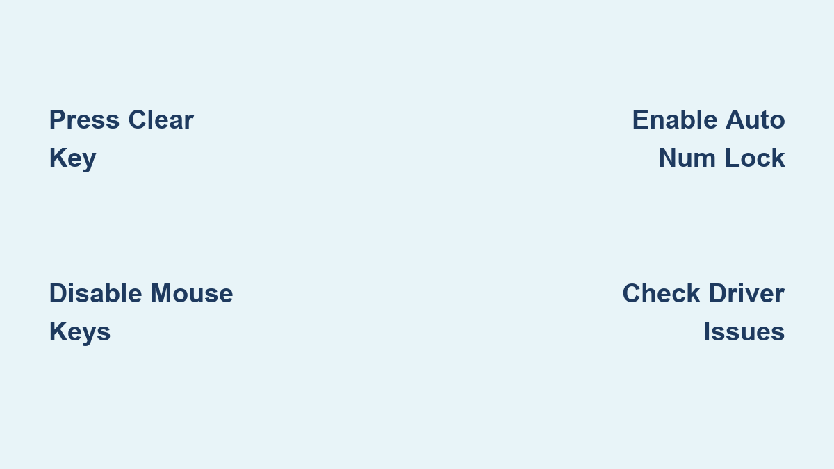 Critical mistake to avoid: Pressing the Clear key while holding Shift or Fn. This triggers its Mac-specific clear function instead of Num Lock. Always press it bare—no modifier keys. If numbers still don’t register after three attempts, Mouse Keys interference is likely blocking input.