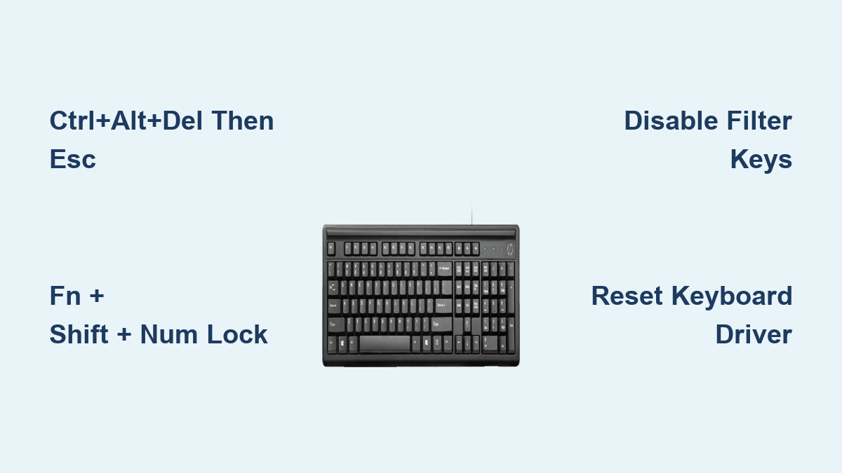 Why this works: Ctrl+Alt+Del triggers a system-level interrupt that resets the keyboard controller’s buffer. When Windows mistakenly flags your keyboard as “unresponsive,” this sequence clears the error state without rebooting. Test this first when no keys respond, including the Windows key. If your cursor moves but keys don’t register, skip to Filter Keys fixes below.
